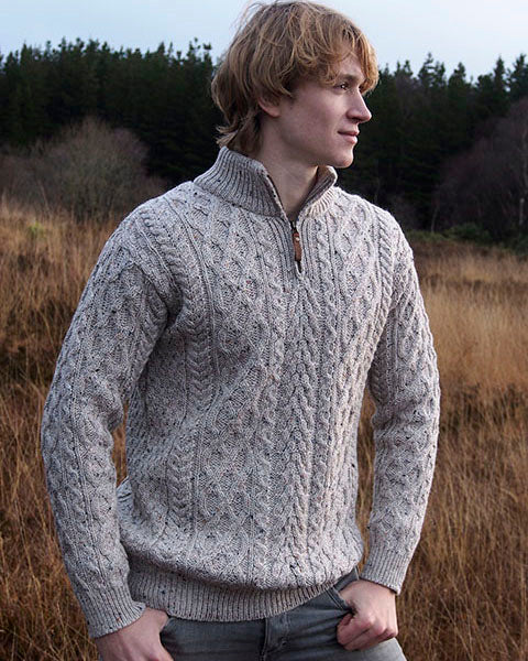 Half Zip Aran Sweater, Made in Ireland from 100% merino wool. This fashionable and very practical half zip sweater has a leather pull which is engraved with a Celtic design. The beautiful lattice pattern with herring bone stitches is a tradition of Irish Aran sweaters.