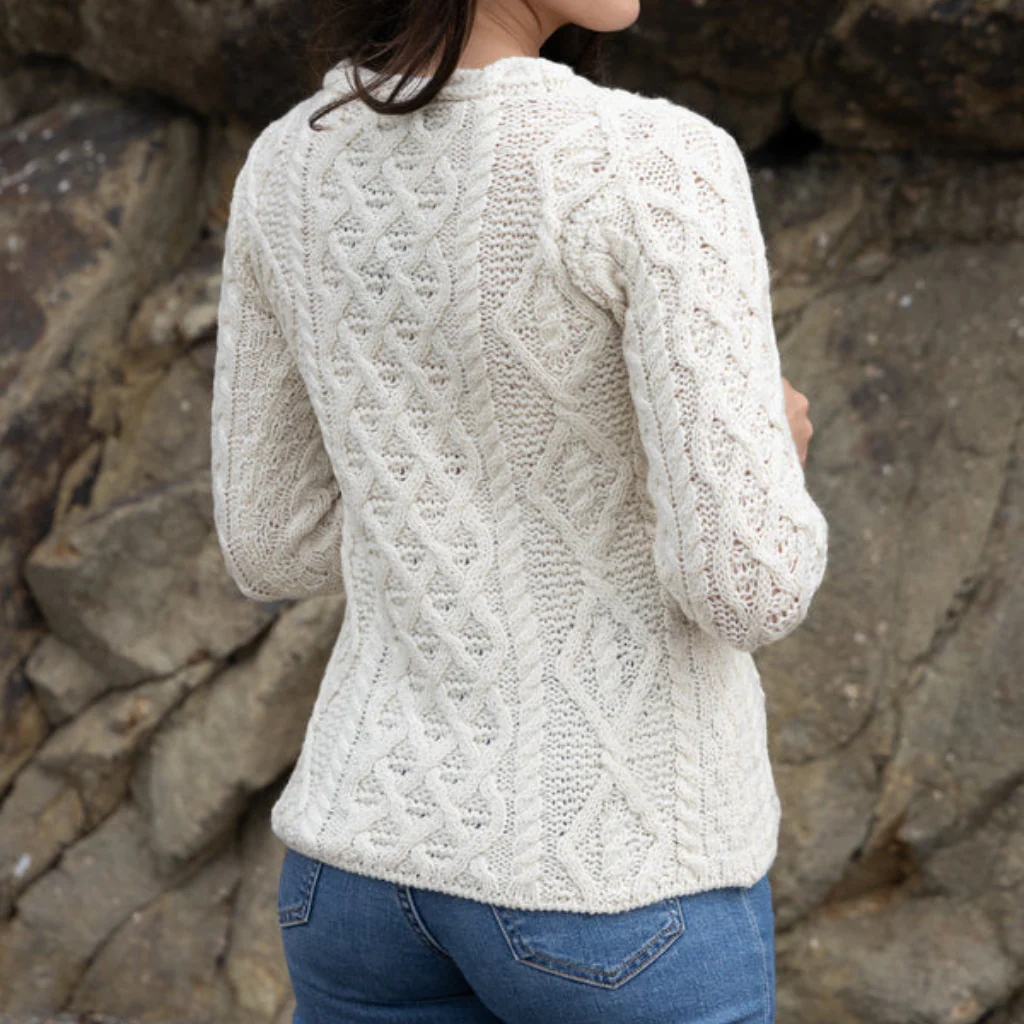 Crafted in Ireland from 100% pure Merino wool, the sweater offers natural softness, breathability, and lasting quality. The Natural shade reflects the original cream colour of Arans, known as báinín, while other colourways introduce a modern twist to this timeless classic.